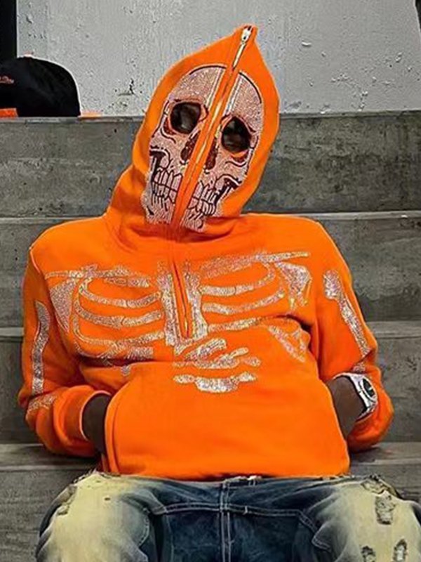 Sudadera con capucha y media cremallera de calavera con diamantes de imitación para hombre