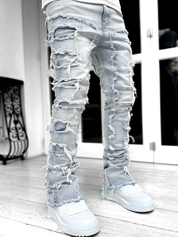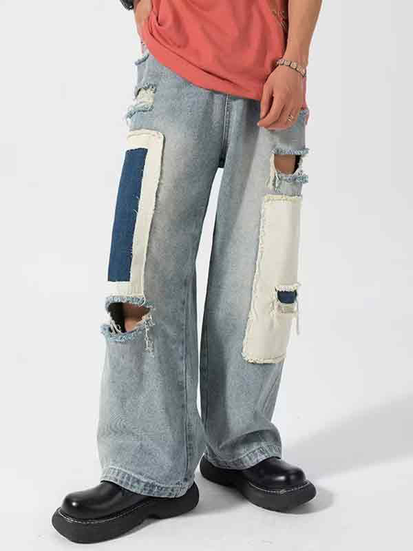 Jeans sueltos con decoración de varios parches desgastados para hombre