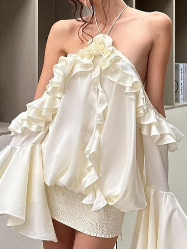 Minivestidos de estilo francés con hombros descubiertos, mangas acampanadas y volantes