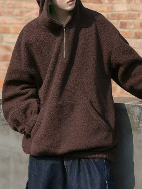 Sudadera con capucha extragrande de lana de cordero lisa con media cremallera para hombre